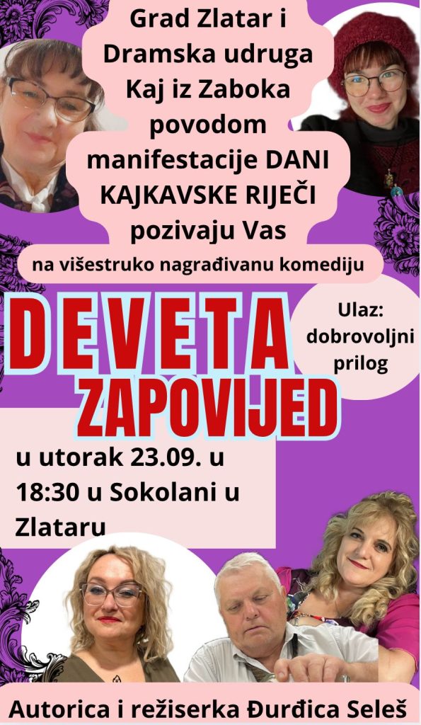 Nasmijte se uz višestruko nagrađivanu komediju „Deveta zapovijed“ sjajne zabočke Dramske udruge „Kaj“, u utorak, 23. rujna, u 18.30  u Sokolani.