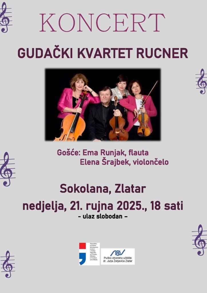 Uživajte uz vrhunsku klasičnu glazbu Gudačkog kvarteta Rucner i podržite mlade Zlatarščanke Emu Runjak i Elenu Šrajbek, u nedjelju 21. rujna u 18 sati, u Sokolani.